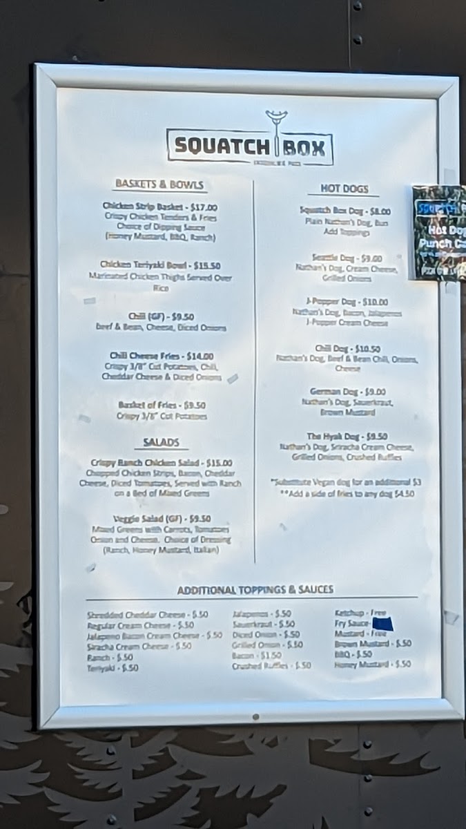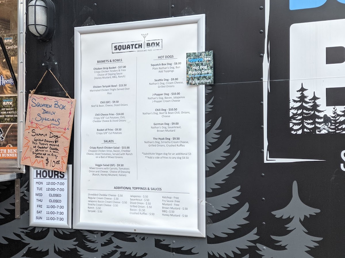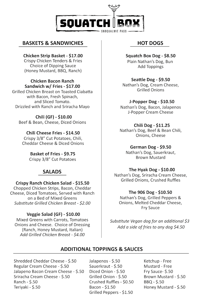 Welcome to Squatch Box, nestled in the picturesque Snoqualmie Pass, Washington. A permanent fixture that has quickly become a favorite for adventurers and locals alike, Squatch Box offers a delightful menu that caters to every craving. Featuring a cozy ambiance complemented by stunning mountain views, it's the perfect pit stop after a day of outdoor fun.